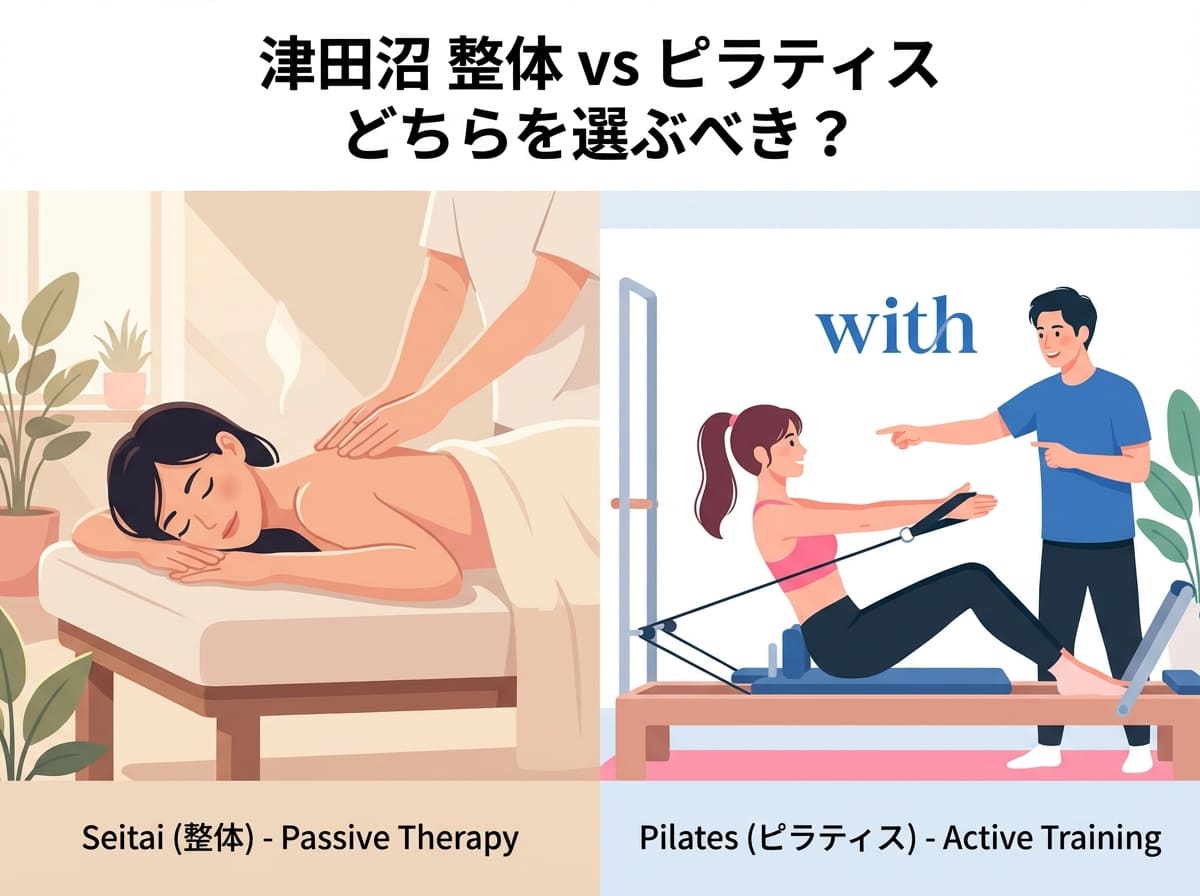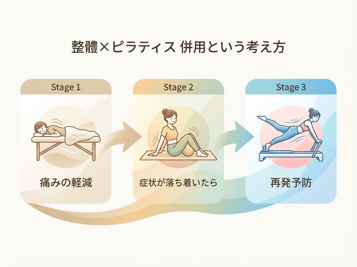 「腰や肩がつらいけど、整体とピラティス、どちらに行くべきかわからない」